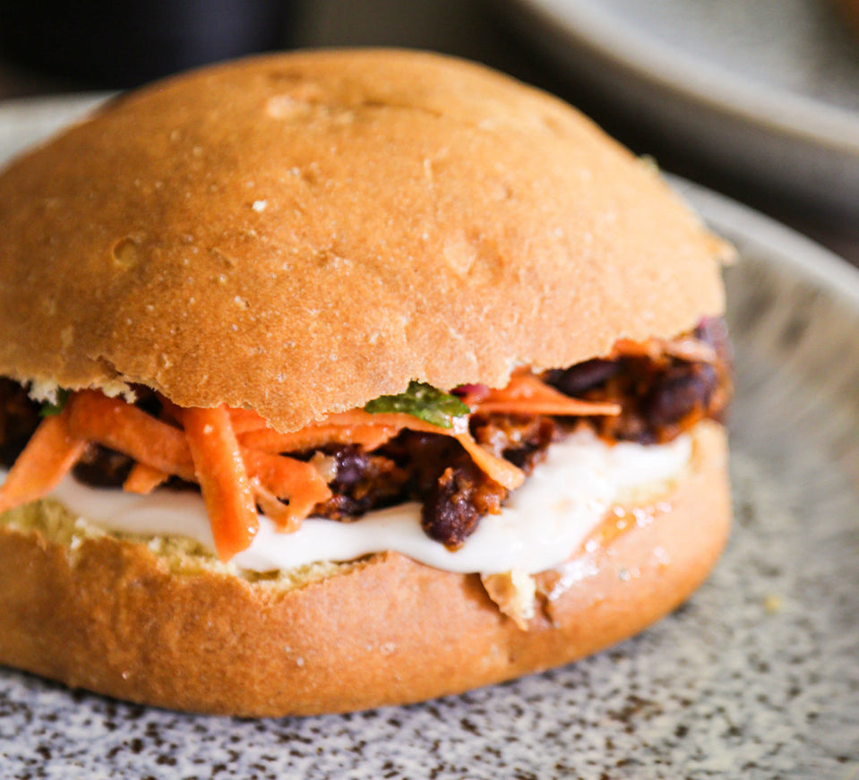 Add a dollop of vegan mayo to the bottom of bun. Pile aubergine BBQ mix on top of mayo and top with coleslaw, mixed leaves & onion.