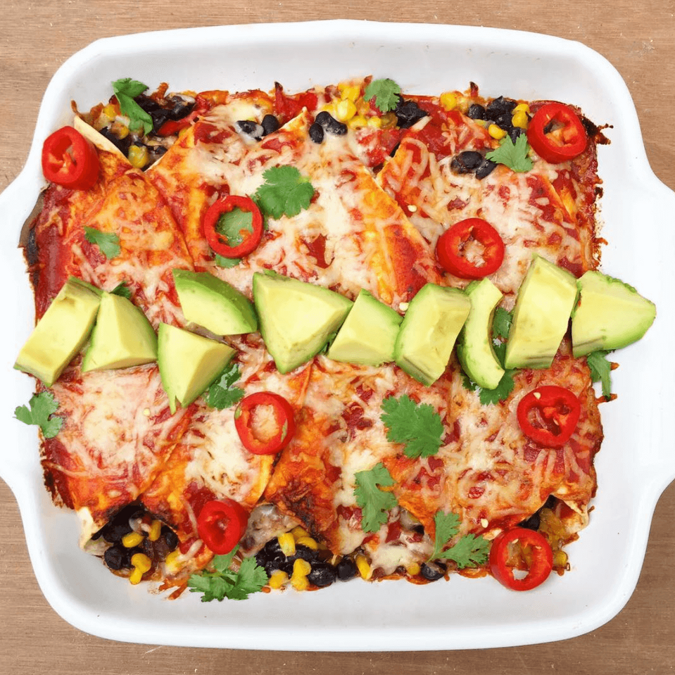 Bake, uncovered, for 20-25 minutes, until the cheese is melted and the tortillas are crispy around the edges. Remove from the oven and serve immediately, garnished with chopped, fresh coriander, the remaining chilli and chunks of avocado. Enjoy.