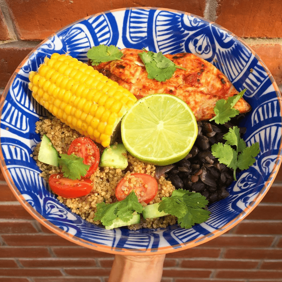 Time to bowl up. Add a hearty helping of both the smoked quinoa mix and the thickened beans to a bowl (doesn’t have to be as patterned as ours). Remove your BBQ-glazed chicken breast from the grill and add to bowl, along with the boiled/grilled corn. Garnish with half a lime and a sprinkling of torn, fresh coriander*.