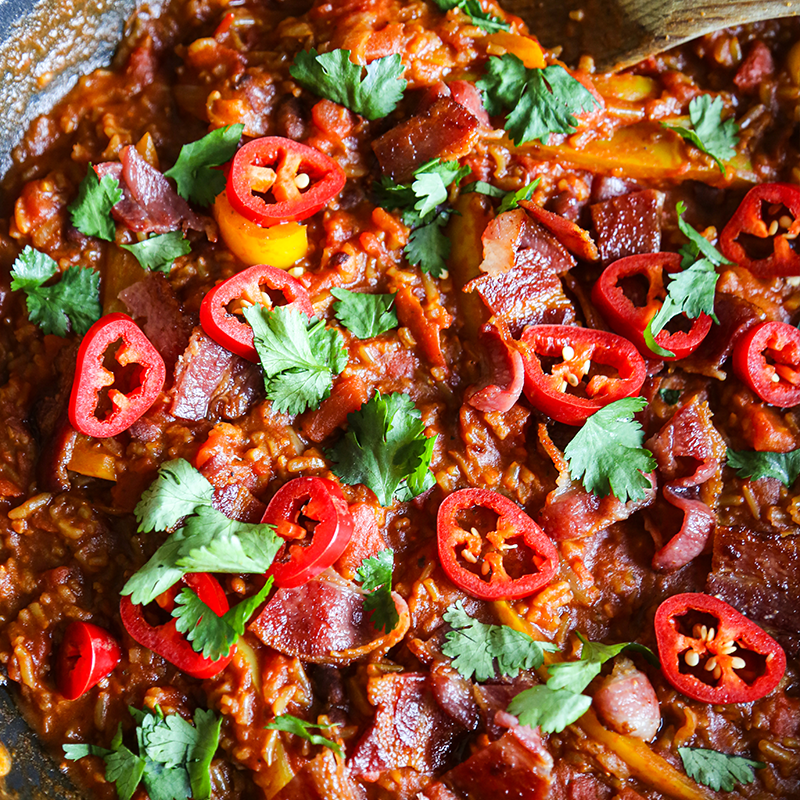 - Add cooked bacon back to pan & garnish with chilli and coriander.