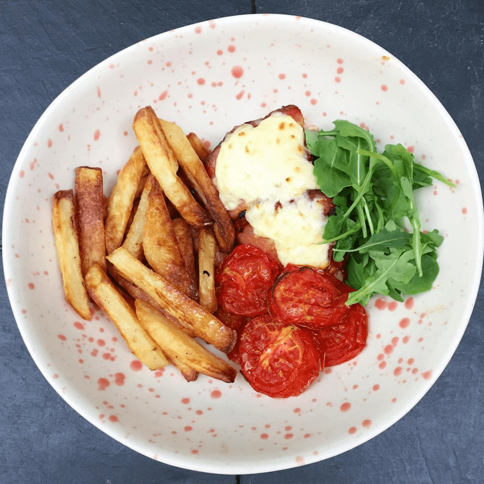 Hunter’s chicken, or cacciatora – a slow-cooked chicken stew, with a hearty tomato and red wine sauce – is a stalwart of the traditional Italian menu. You may have paused to wonder what kind of hunter, Fantastic Mr Fox aside, would go out hunting and come back with a chicken. Not a very adept one, we’d guess. But jokes aside, it’s more likely this dish was cooked up for hunters after a tiring day's graft or as Jamie Oliver puts it ‘the type of food that a hunter’s wife cooks for her fella(!) when he gets home from a hard morning spent in the countryside.’ We’d have to agree with Jamie on this one, though we suspect it’s more likely to have been made with game or rabbit.In fact, we’ve misled you. Because this ‘hunter’s chicken’ isn’t anything like the Italian original. Other than the fact that chicken is the key ingredient, there is nothing we can find that ties the two recipes together. Indeed this version is the kind you’d expect to find on a classic pub grub menu, rather than from the rustic kitchen of an Italian housewife. There's tender chicken breasts, BBQ Sauce, crispy bacon and melted cheese…what’s not to love? Served up with slow-roasted tomatoes and oven-baked chips (much healthier than their deep-fried cousins), you’ve got yourself a delicious mid-week supper. We spoil you, we really do.