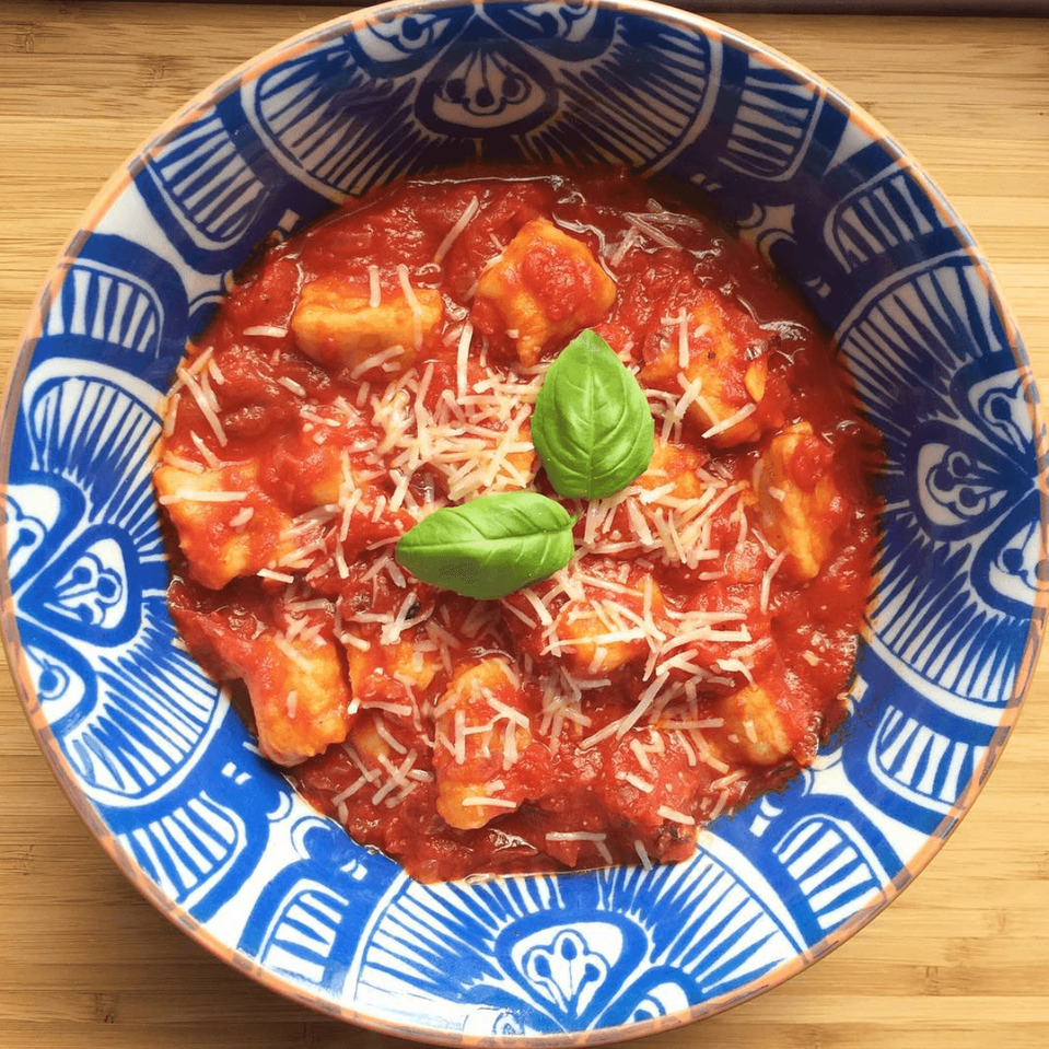 Once ready, drain and add to the frying pan with your tomato sauce. Leave to cook for around 30 seconds, stirring gently so as to coat the gnocchi.