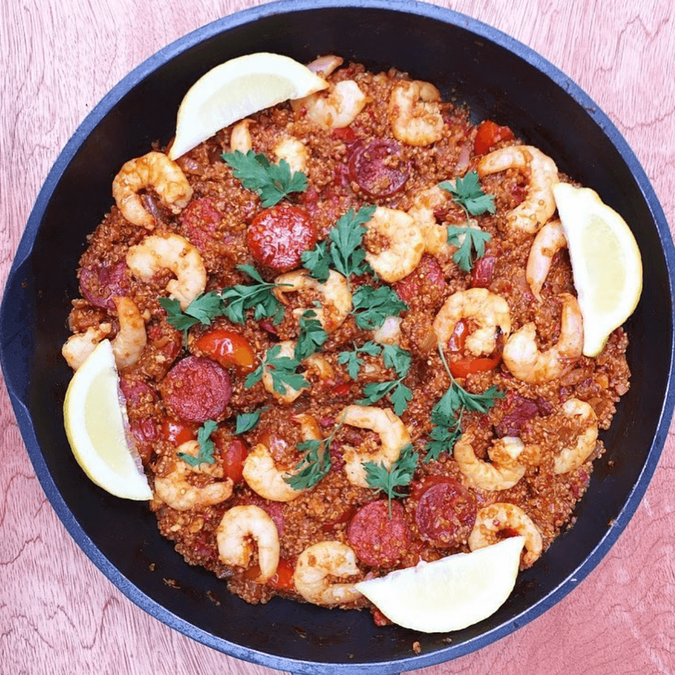 So in the nature of going against the grain (*winky face*)/completely ignoring the handbook on how not to aggravate paella preservationists, we’ve come up with our own twist on the Spanish dish made with the superfood quinoa instead of white rice and studded with plump prawns and, you guessed it, chorizo. It’s true that many recipes ‘with a twist’ can put the reader in a state of high alert (adding pineapple to anything is the most prevalent of foodie crimes) but paella is a dish so versatile that you can tweak it and twist it as you like, and you’re pretty much guaranteed to end up with an impressive crowd pleaser.