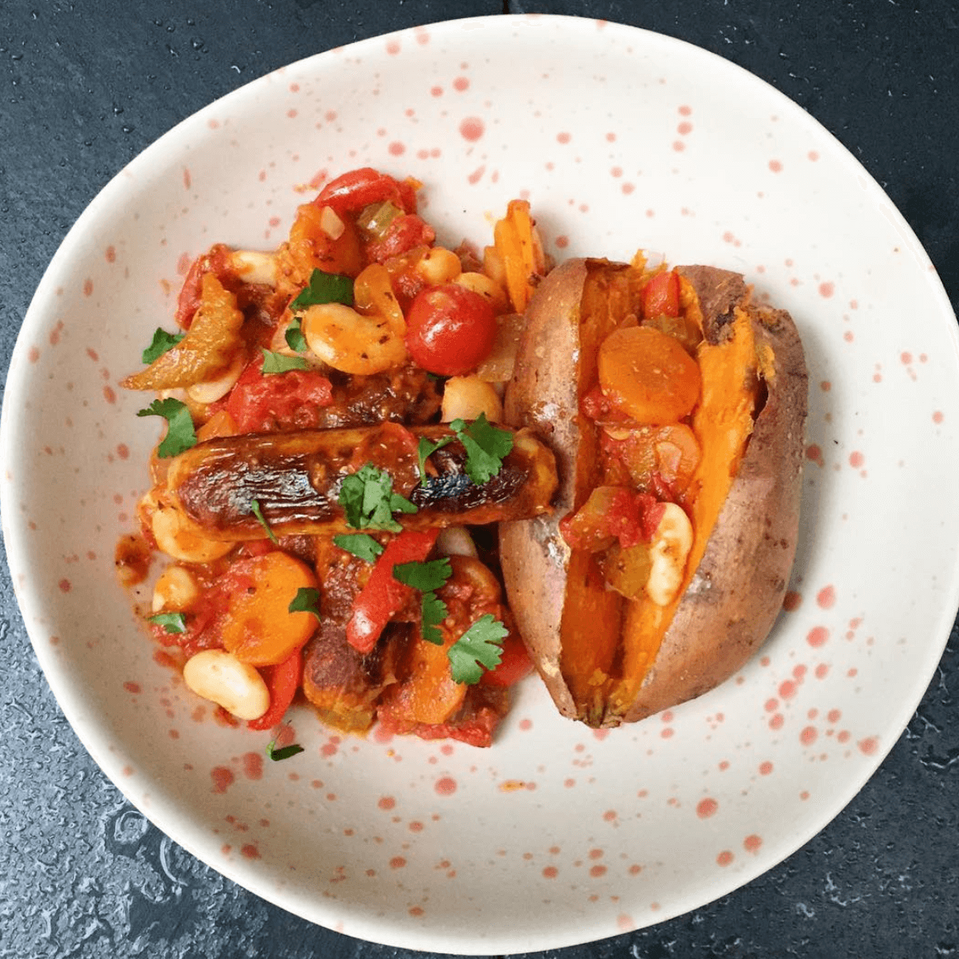 Add the mustard and the drained butter beans, mix well, and cook for a further 10 minutes, until the beans are warmed through*. Remove the bay leaf, season well, sprinkle with chopped chives and serve with your piping hot sweet potatoes.