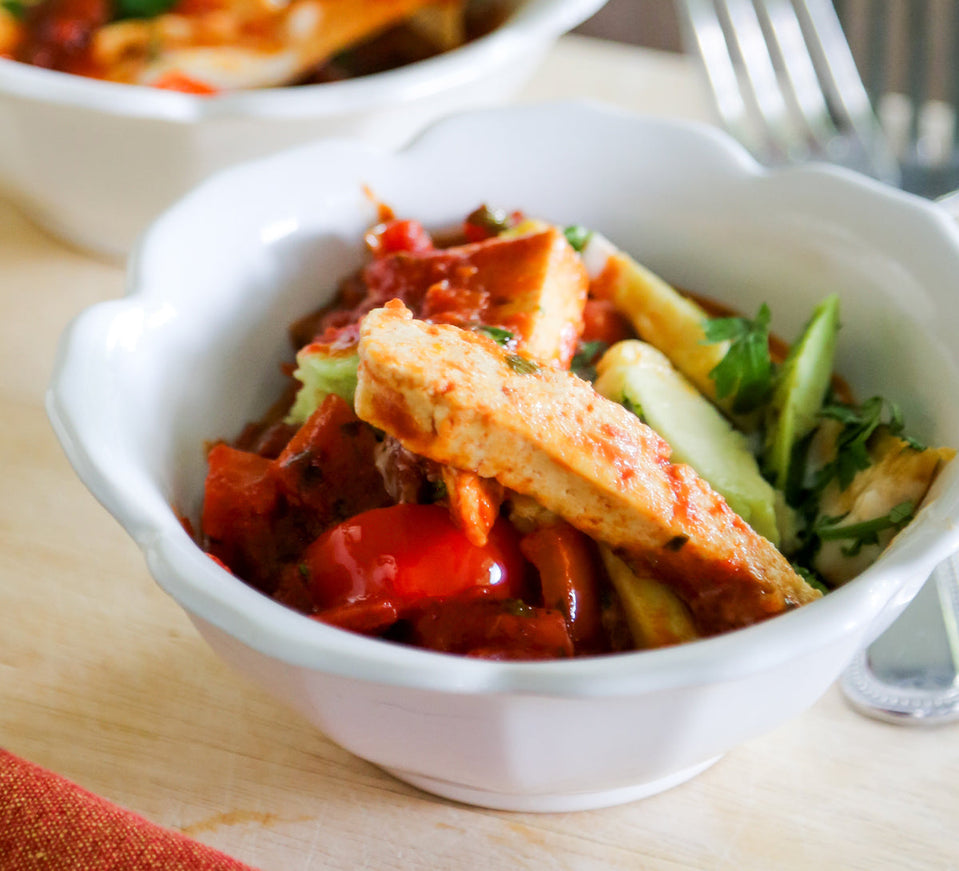 Add tofu to the pot & sprinkle with vegan feta. Place pot into oven & bake for 15-20 minutes or until feta is slightly melted.